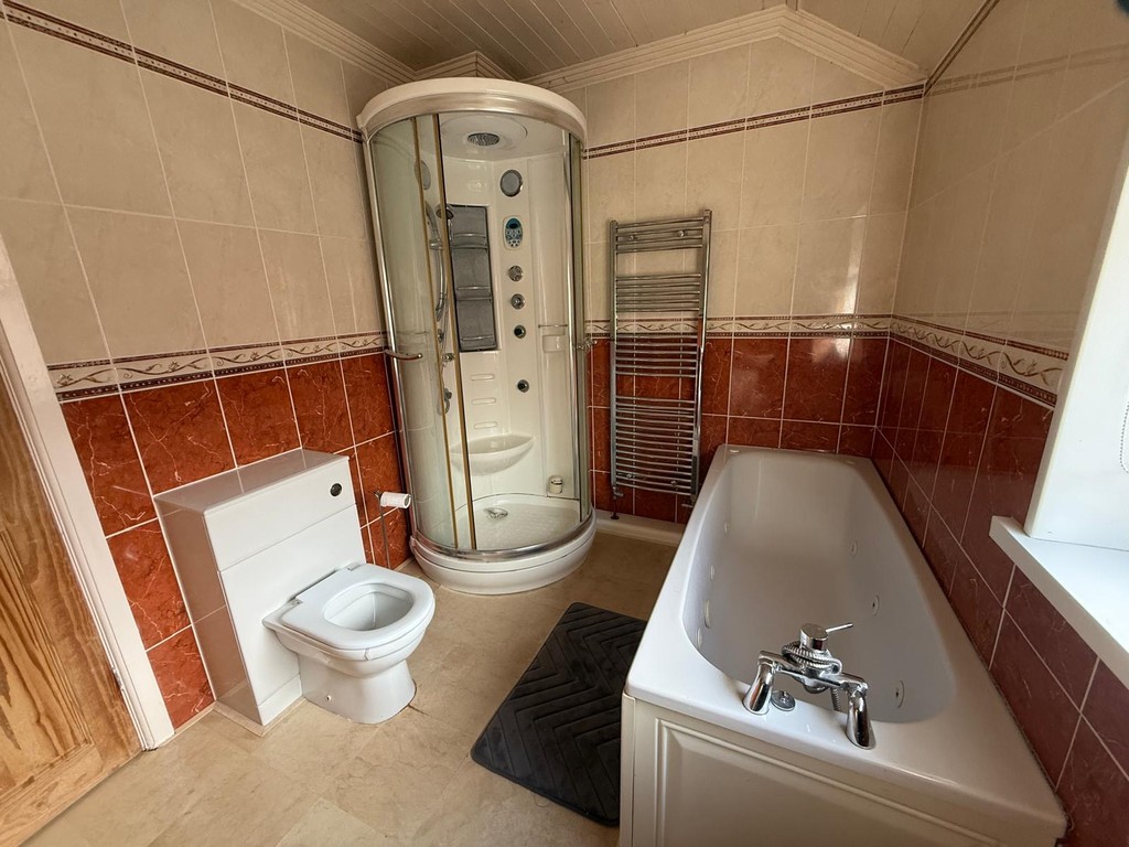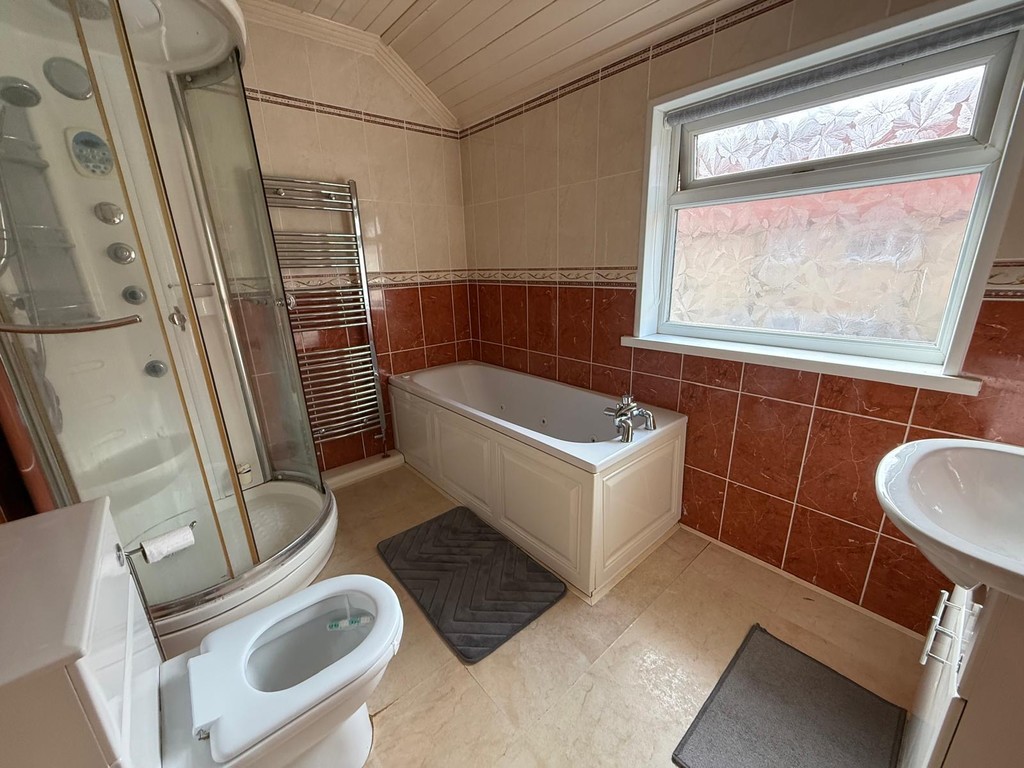 BATHROOM Double glazed window, white fitted bathroom suite comprising, bath, shower cubicle, WC, vanity sink unit, ceramic wall tiles.