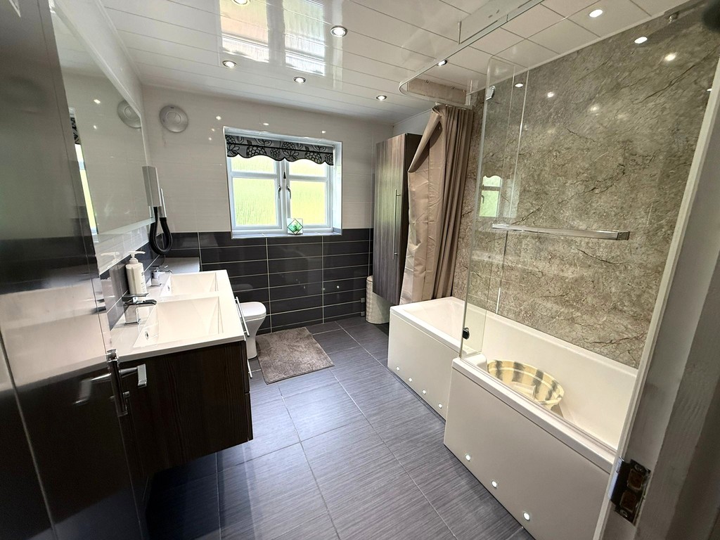 FAMILY BATHROOM White bathroom suite, comprising bath with shower over bath and screen, WC, 2 x vanity sink unit, hair dryer, heated towel rail. TV to wall, spotlights to ceiling.