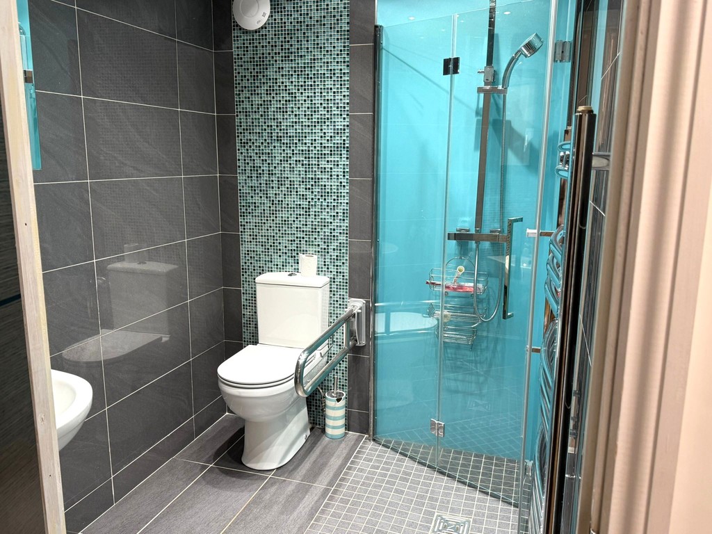 DOWNSTAIRS SHOWER ROOM WC, sink unit, rain fall shower, heated towel rail, ceramic wall tiles, spotlights to ceiling.