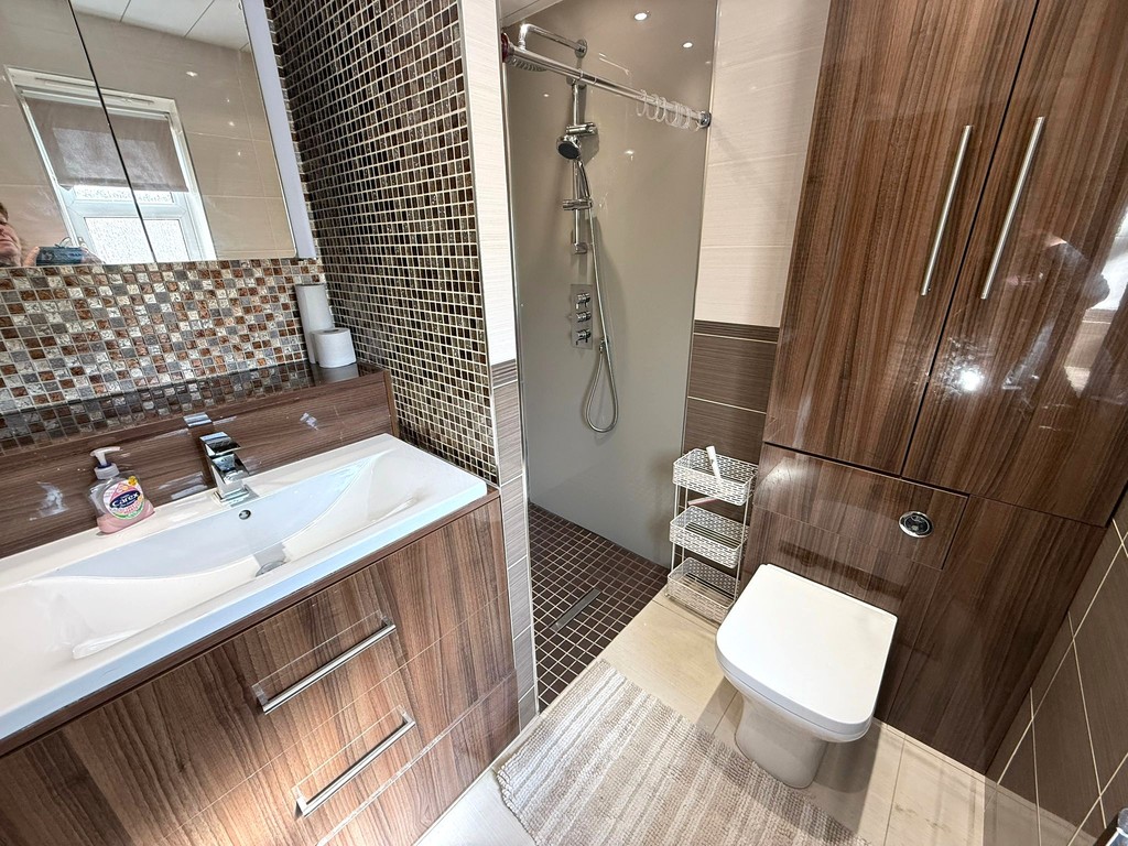 ENSUITE SHOWER ROOM (BEDROOM TWO) Double glazed window, shower cubicle with rainfall shower, vanity sink unit, wall units, WC, spotlights to ceiling,