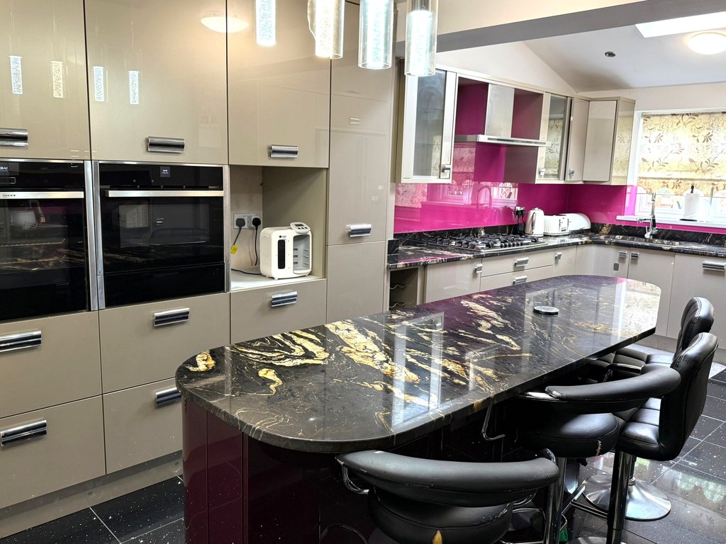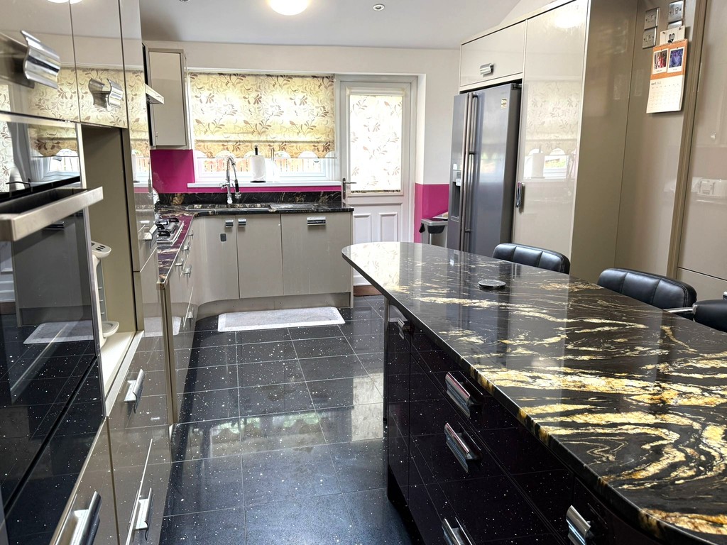 KITCHEN 20' 5" x 11' 7" (6.22m x 3.53m) Double glazed window, fitted high gloss kitchen units with integrated appliances and granite work surfaces, kitchen island, glass display cabinets, double electric oven five ring gas hob with extractor canopy, double sink unit with mixer plumbing for fridge/freezer, door to rear garden.