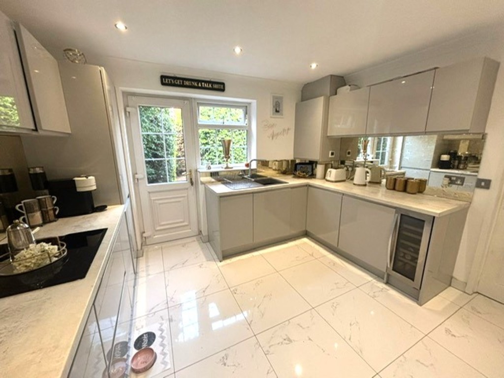 KITCHEN 12' 0" x 11' 0" (3.66m x 3.35m) Double glazed window fitted high gloss kitchen units with work surfaces, induction hob, double oven and microwave, integrated dishwasher, fridge/freezer, sink unit with mixer tap, storage cupboard, porcelain effect floor tiles, Integrated single garage, plumbing for automatic washing machine and dryer.