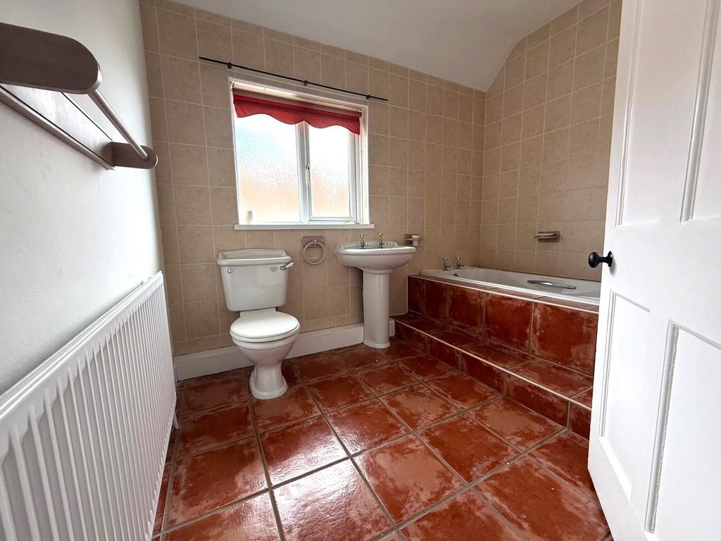 BATHROOM White suite comprising :- Panelled bath, pedestal wash hand basin, close coupled toilet suite, central heating radiator, double glazed window.